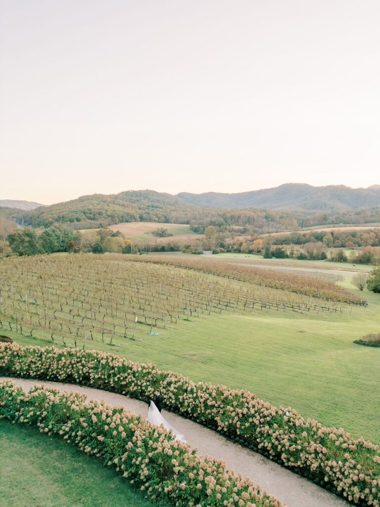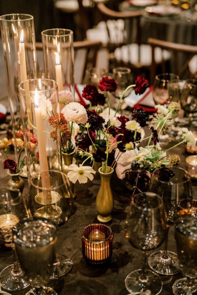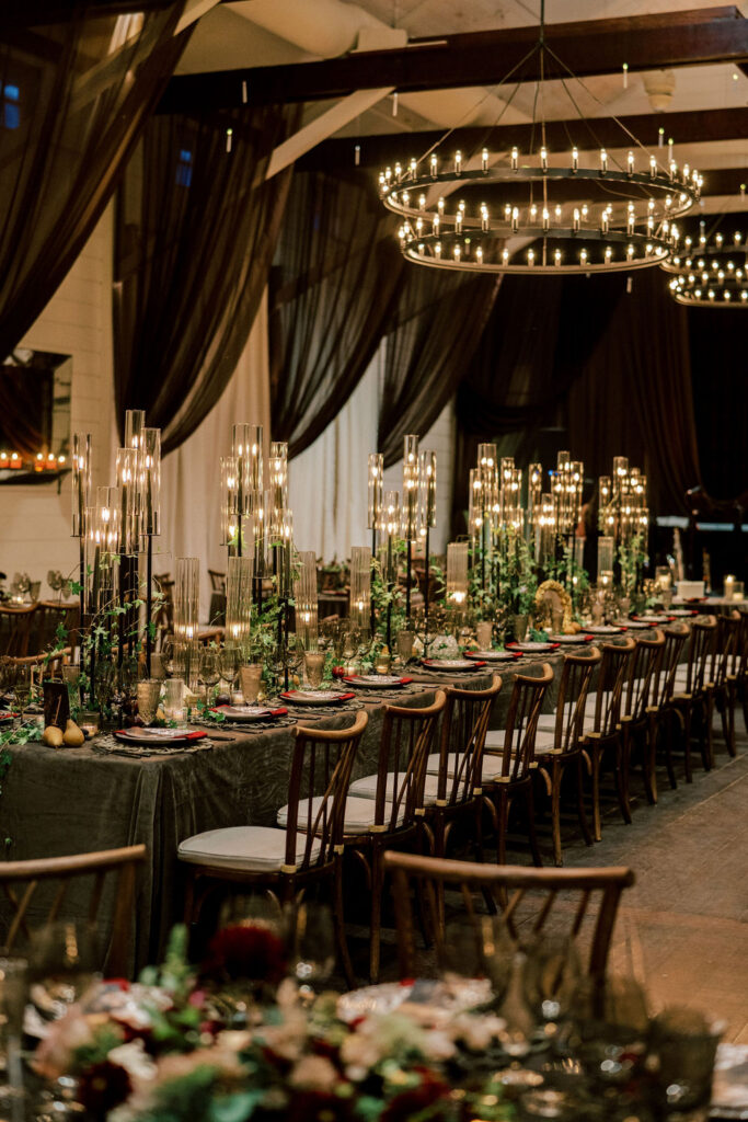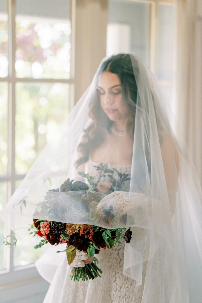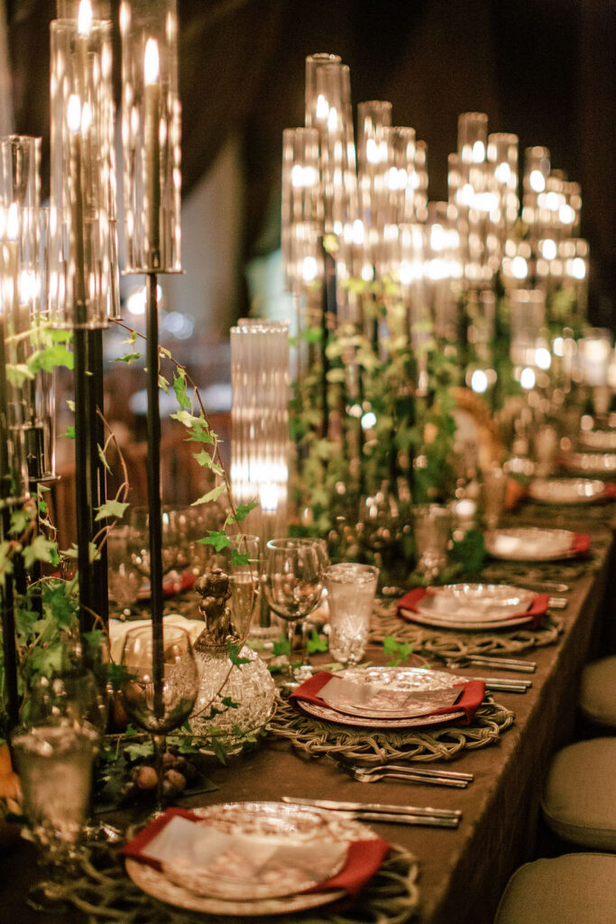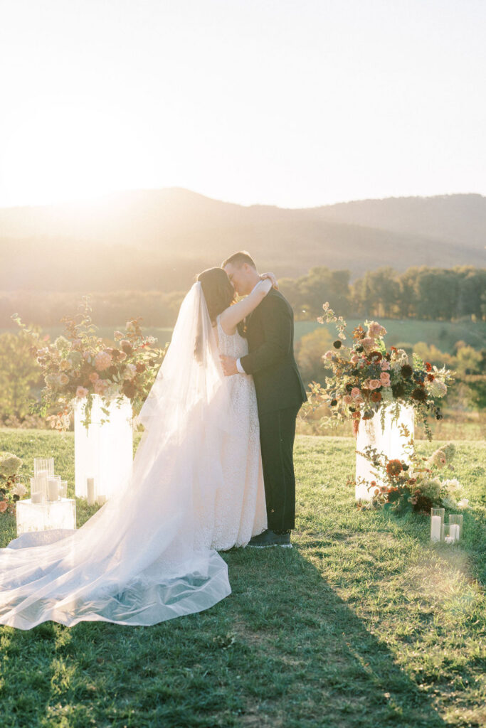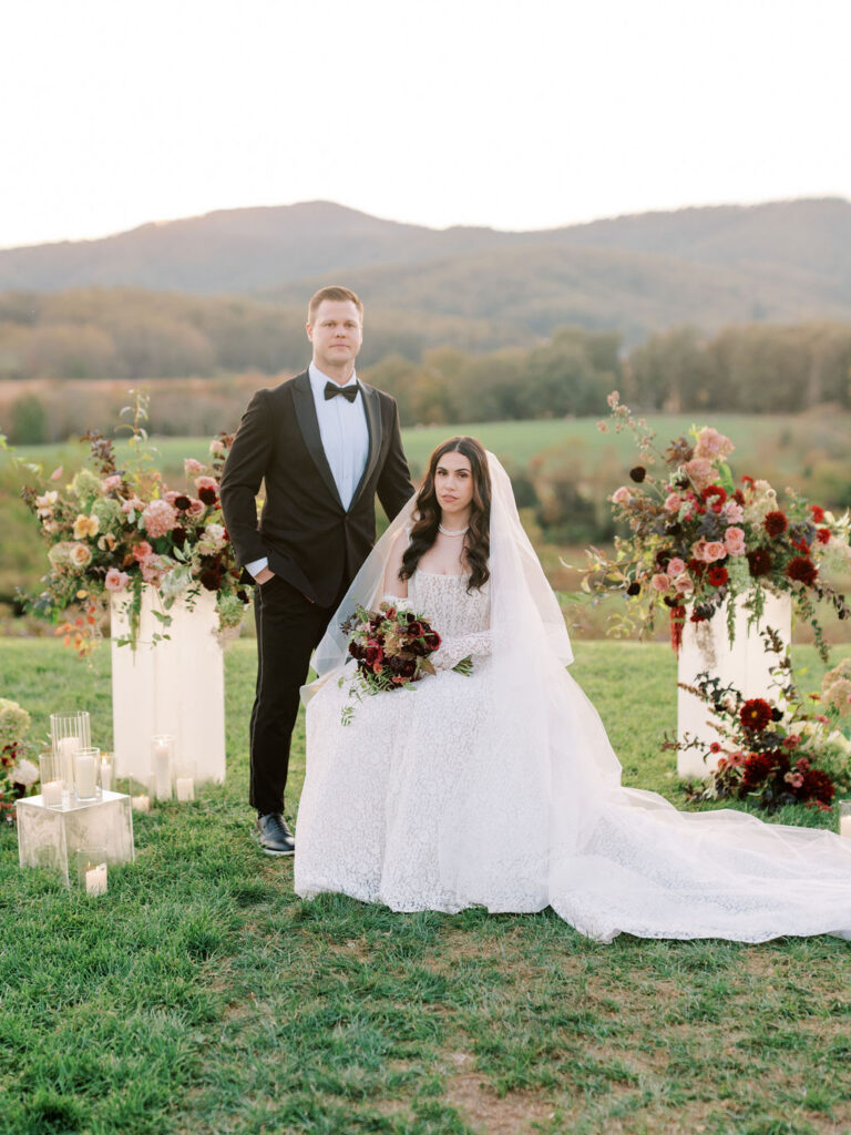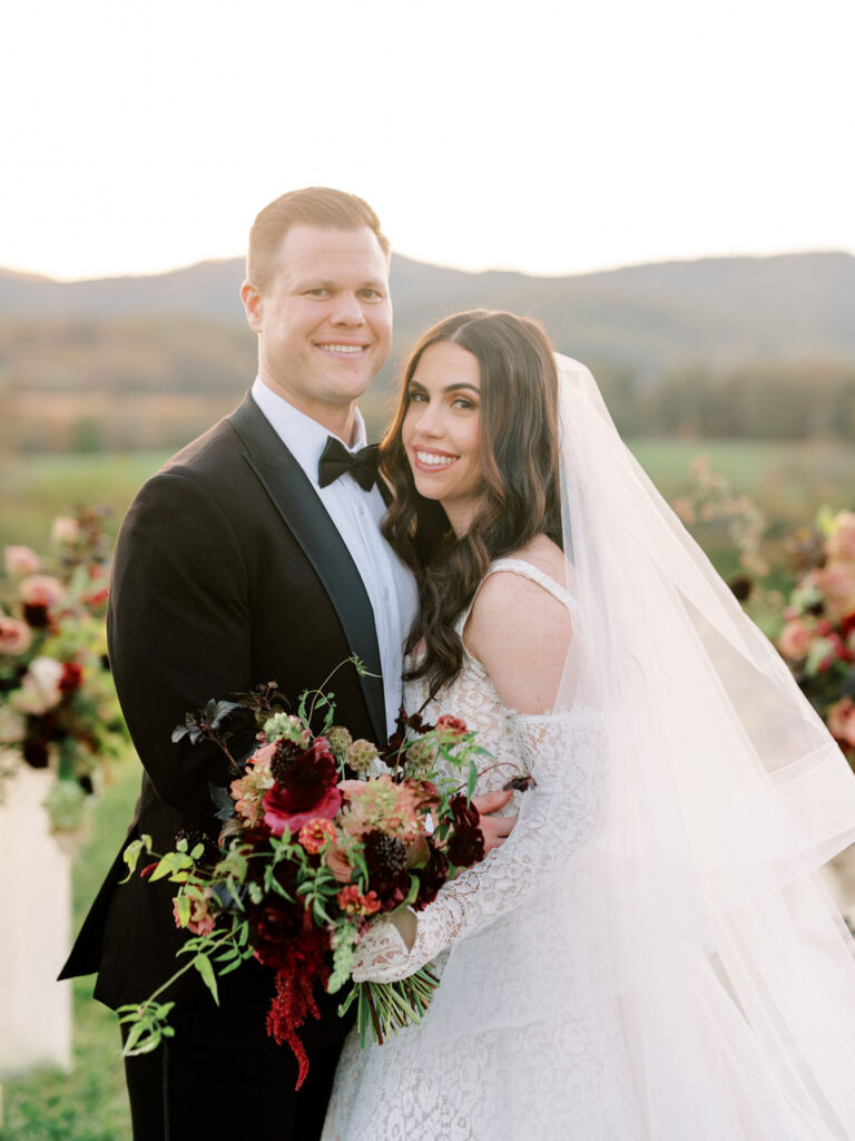 Jess and Christian got married at the iconic Pippin Hill Farm in one of Virginia’s most beautiful months, October. Fall in Virginia is one of my favorite times of the year. Jess and Christian made sure to pay homage with an explosion of moody fall colors and decor. I don’t think I’ve ever seen a Pippin Hill Farm wedding look so unique. The warm chocolate draping, floating candles and deep red florals and cascading greenery were a true experience.